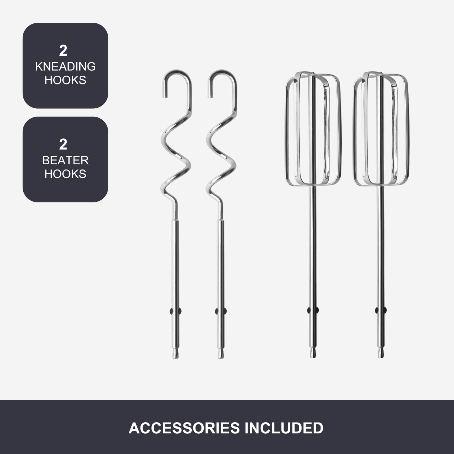 | Attachments | 2 Stainless Steel Whisks and 2 Dough Hooks |