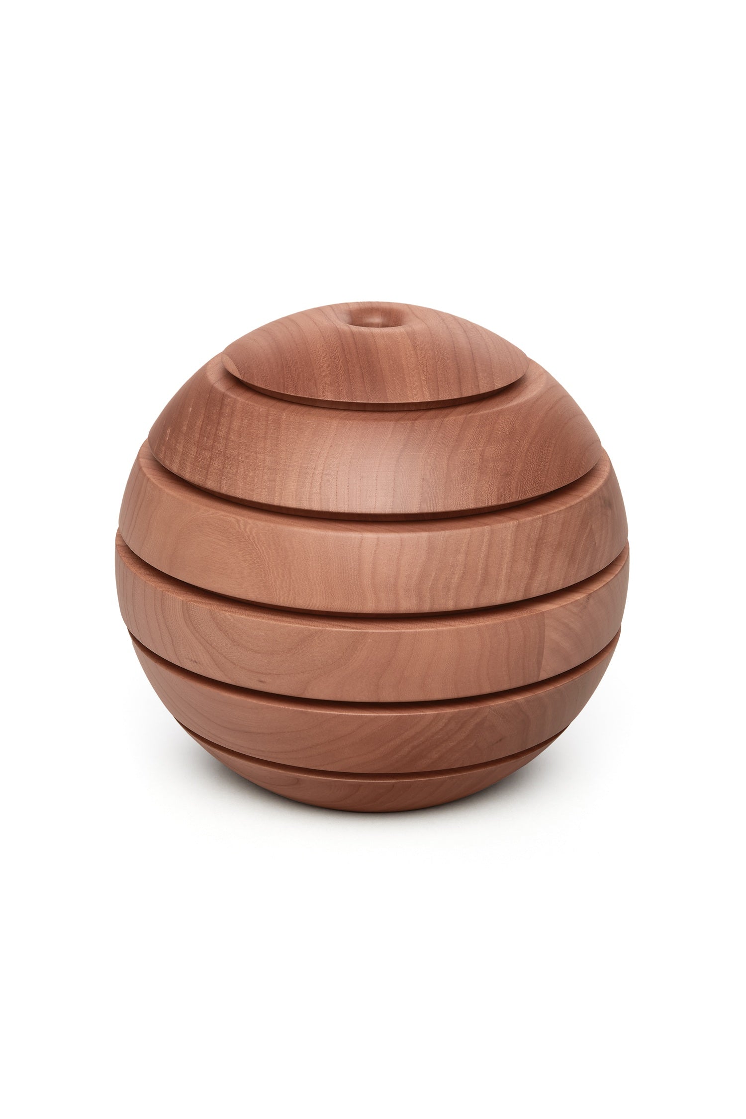 Selbst wenn Sie sie nie benutzen würden (was schade wäre), könnten Sie sich einfach zurücklehnen und sie bewundern. Bewundern Sie sie wegen ihrer feinen Form, den satten Farben und der Maserung der hochwertigen europäischen Kirsche. Diese skulpturale Kugel öffnet sich zu einem Set aus vier Servierschalen. Und jede Schale bleibt dank der sorgfältig geschnitzten Details an den Böden wunderbar stabil. Auf dem Buffet oder der Anrichte macht sie eine gute Figur -