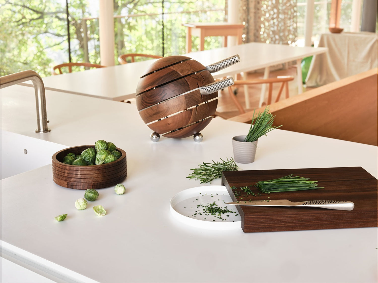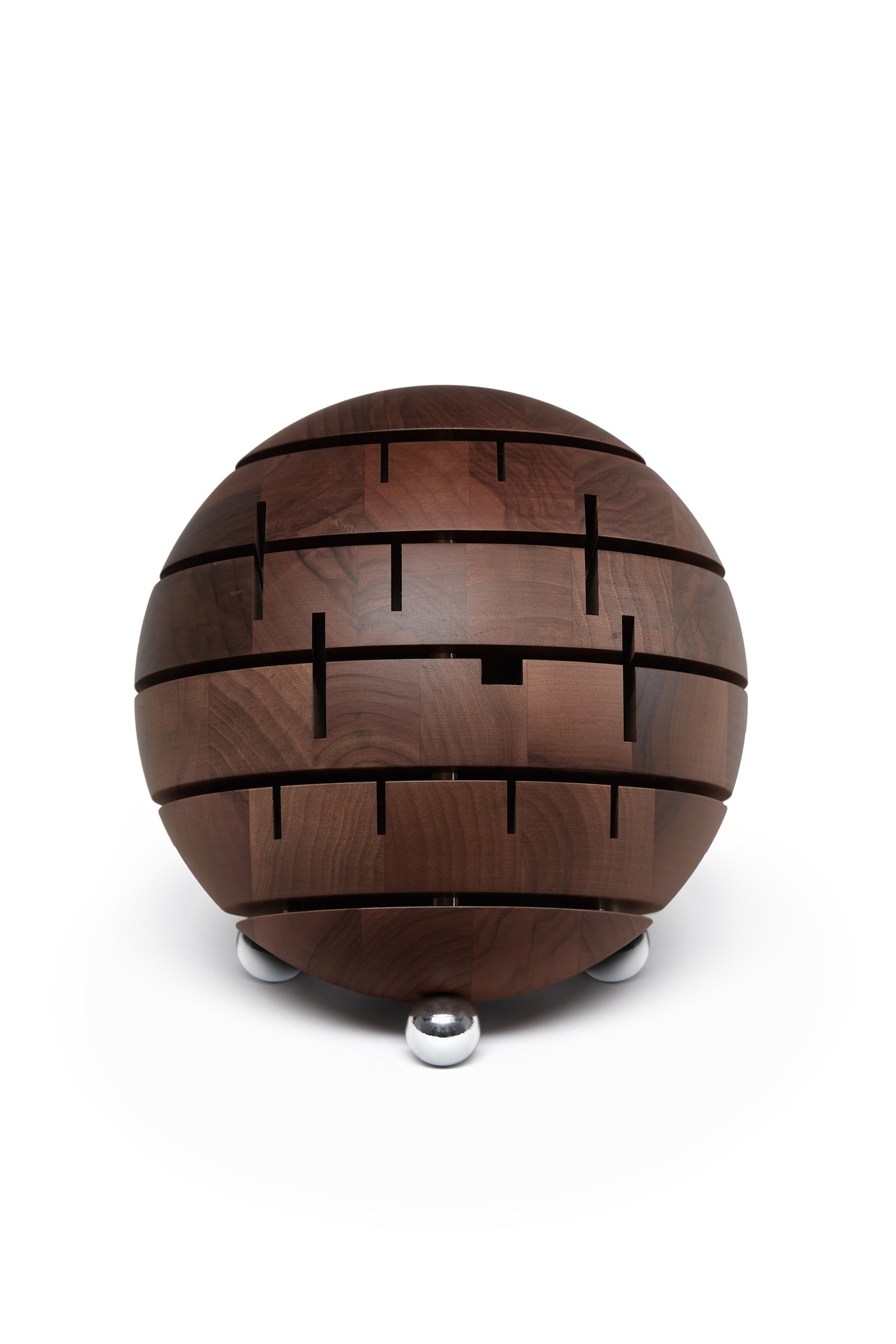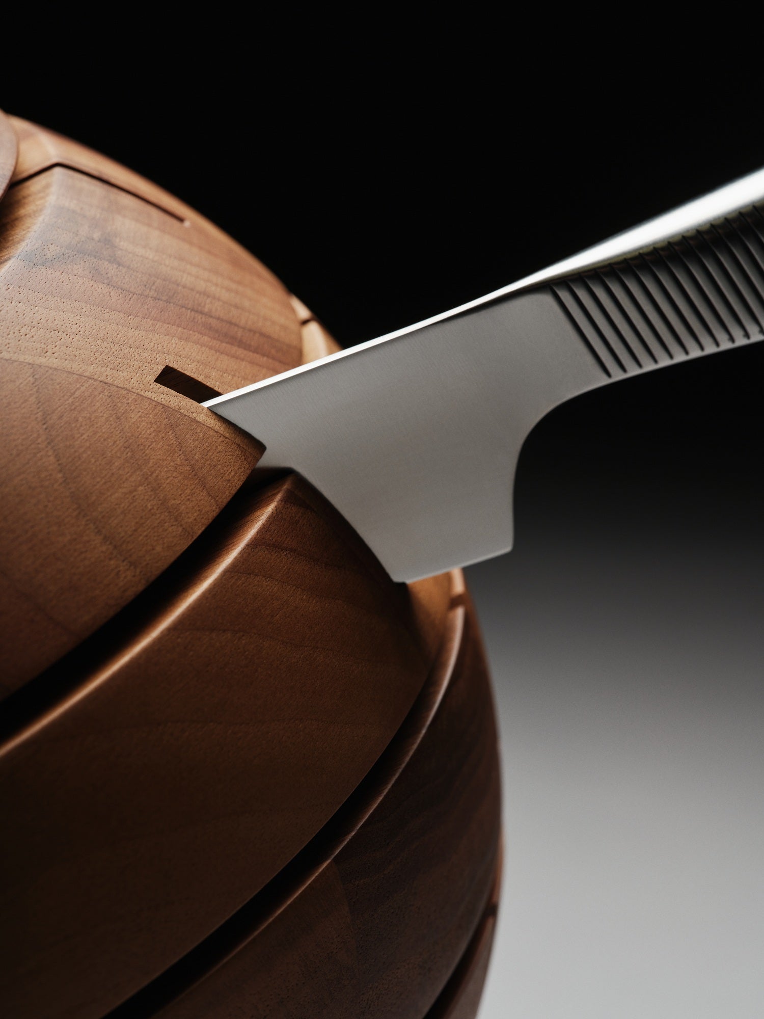 Kochen ist eine Frage der Erfahrung, der Intuition und des Timings - und dieses elegante Designstück sorgt dafür, dass das Messer, das Sie brauchen, immer zur Hand ist. Dieser sinnlich geformte Block bietet Platz für 12 Messer und einen speziellen Schlitz zum Schärfen. Drei verchromte Füße sorgen für einen stabilen und eleganten Stand, so dass er nicht nur benutzt, sondern auch gesehen werden soll. Hergestellt aus hochwertigem, leicht lackiertem europäischem Nussbaumholz.