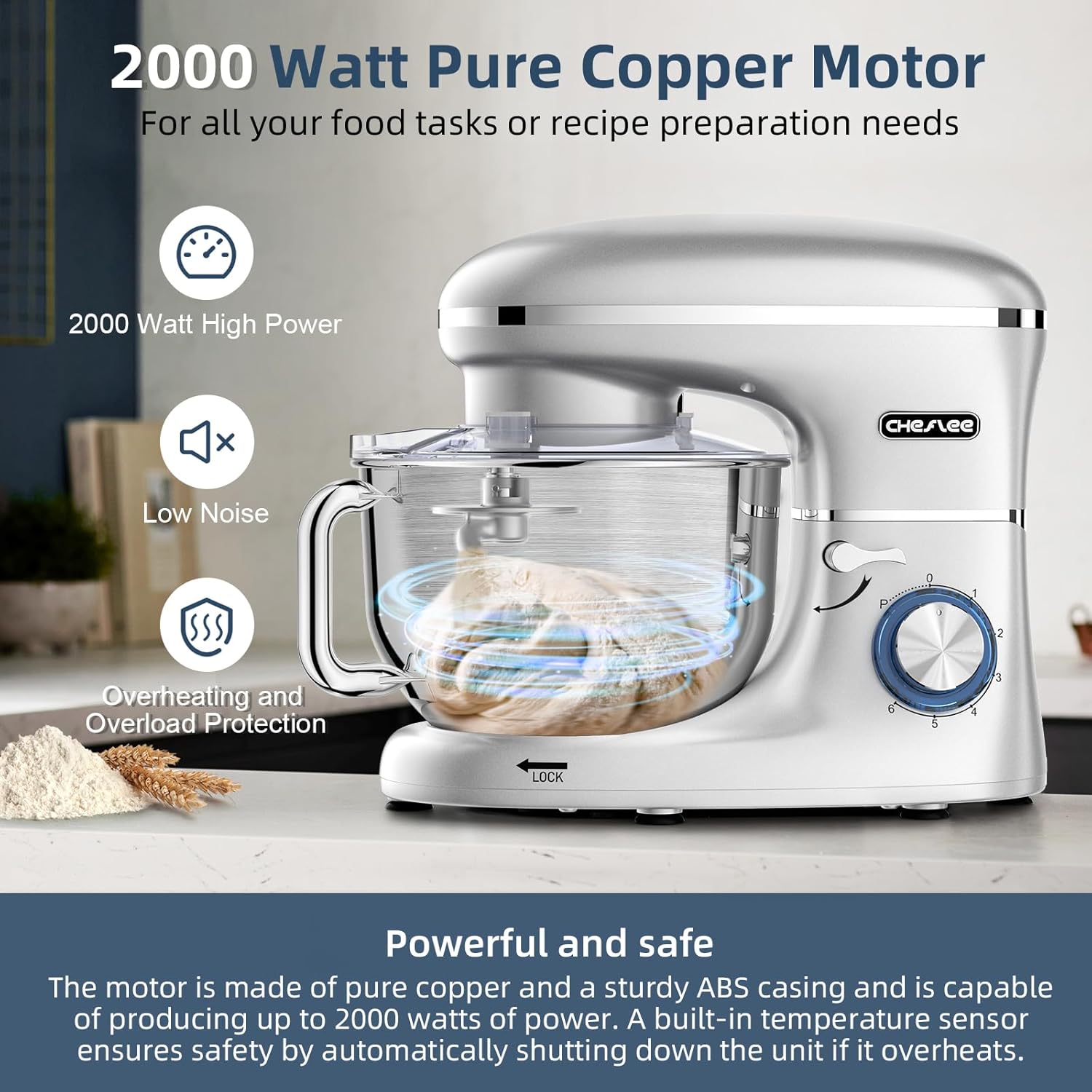CHeflee 2000W Electric Stand Mixer with 6.5 Quart Steel Bowl