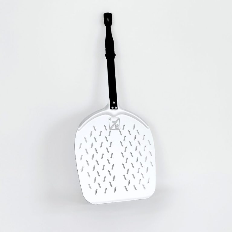 Optimale Handhabung: Die perforierte Oberfläche ermöglicht ein einfaches Einschieben und Herausnehmen der Pizza, während überschüssiges Mehl effektiv entfernt wird.