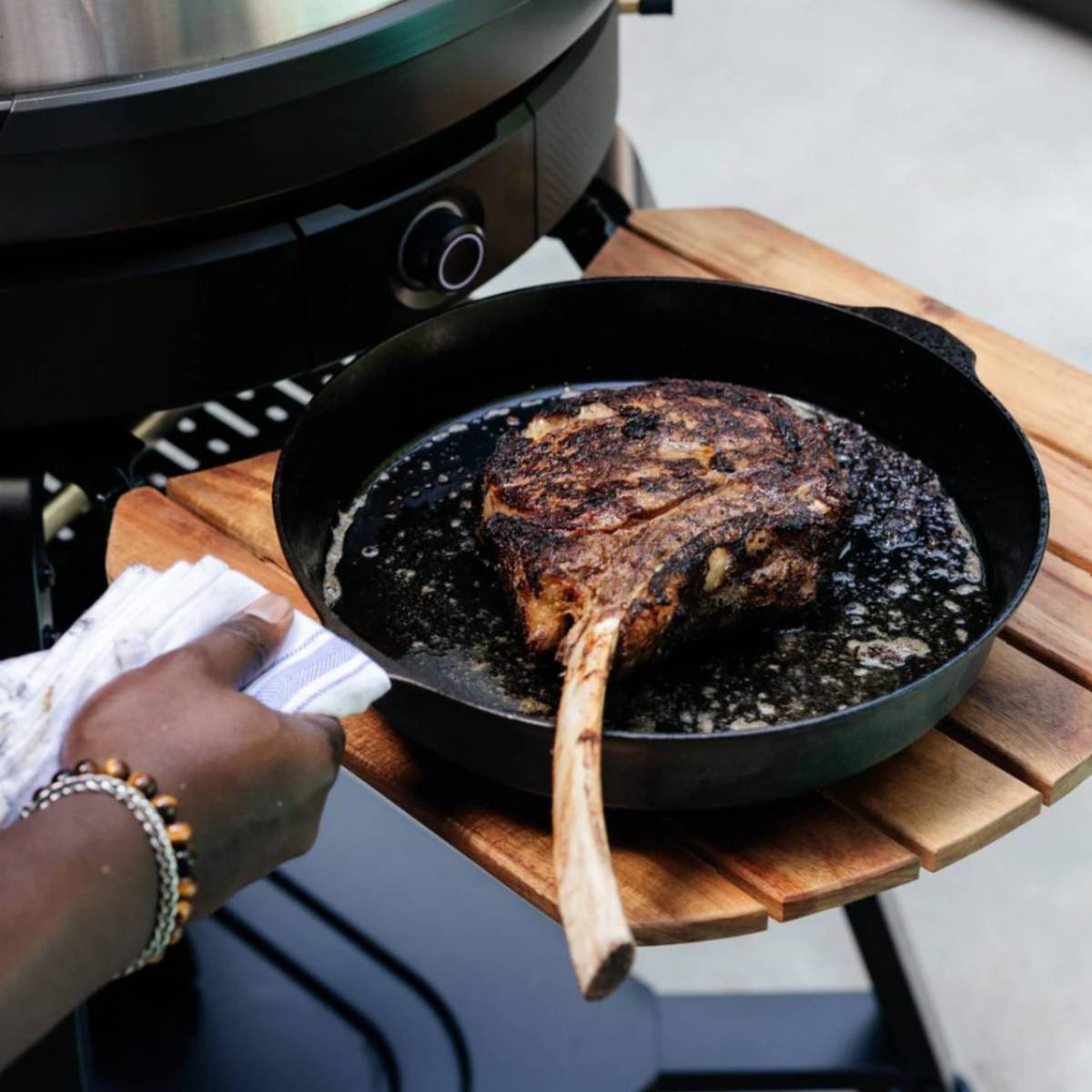 Besonders praktisch sind die beiden Seitentische aus edlem Holz: Sie bieten großzügige Ablageflächen, auf denen Sie Zutaten vorbereiten, Speisen garnieren oder fertige Gerichte stilvoll anrichten können. Alles ist griffbereit – für ein entspanntes und professionelles Kocherlebnis im Freien.